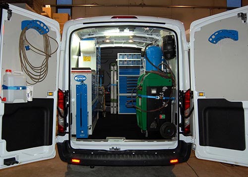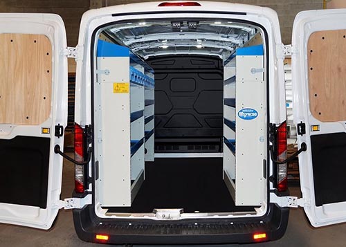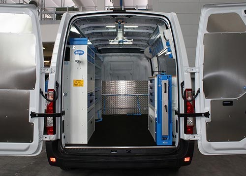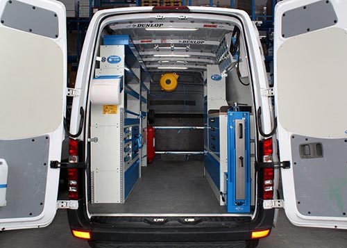 Allestimento per carri ponte Un piccolo furgone può essere perfettamente funzionale al servizio di una grande attrezzatura: vedi qui, per esempio, come una semplice scaffalatura possa risultare preziosa quando si ha a che fare con pezzi di ricambio ed utensili di grandi dimensioni.